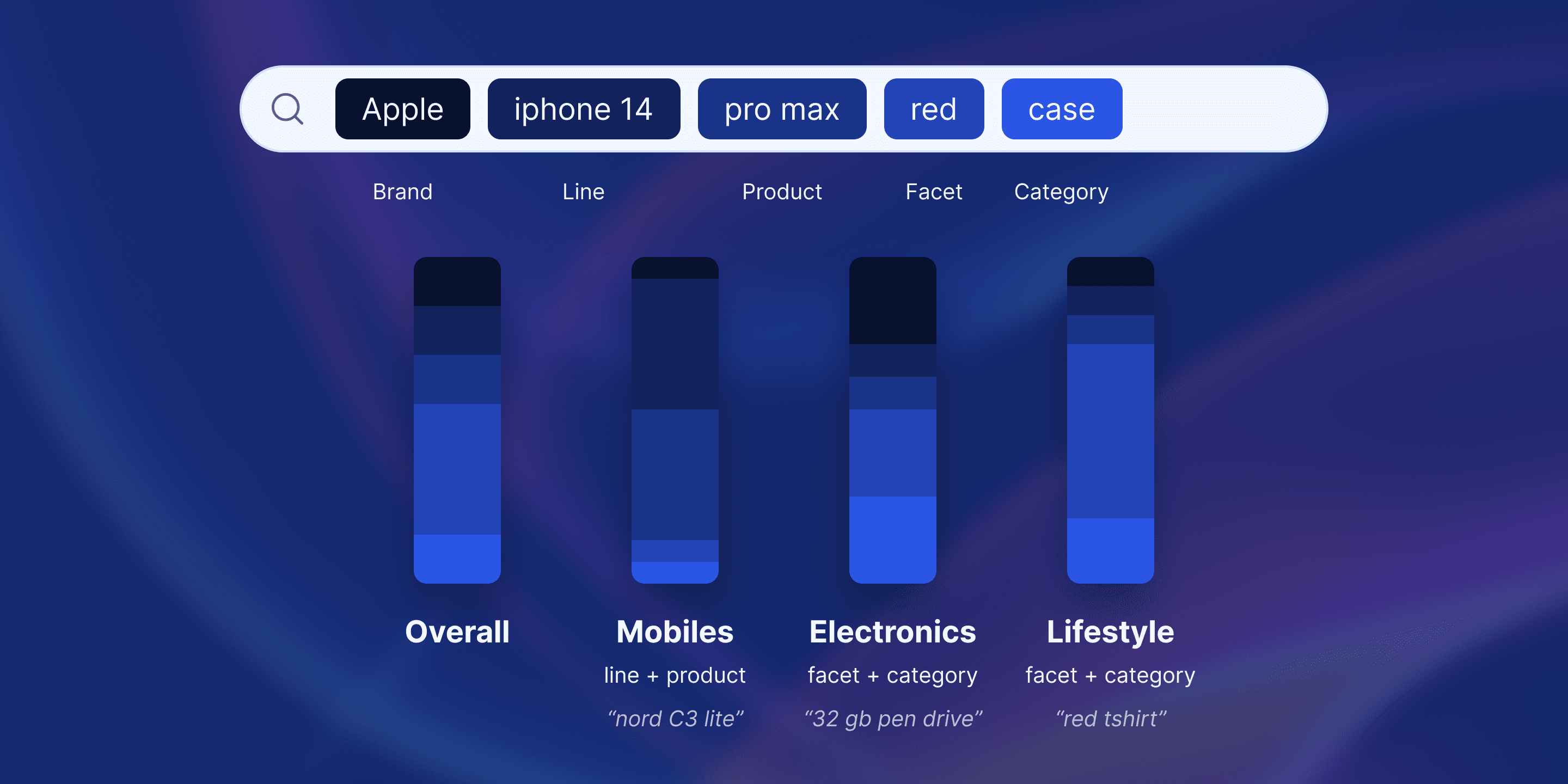 A user's search query is analysed by breaking it down into units, called tokens. They fall into a few well-understood types: Brand, Category, Product, Facet (basically any adjective) to name a few. By ranking popular searches, we can understand the spread of queries that come in for any filtered set of search journeys, and define design goals for that set. This "filtered set" can be a category of products, a user cohort, or any other grouping of queries.